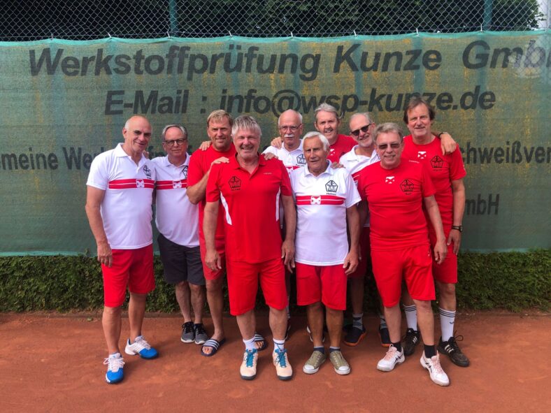 Das war schon eine tolle Saison! Nachdem unsere Herren 50 im Mai und Juni mit vier Siegen gegen Halver, Allendorf, Hemer und Menden schon den Grundstock für höhere Ziele gelegt hatte, konnte nach den Sommerferien auch das Spiel gegen Brilon souverän gewonnen werden. Somit fehlte nur noch ein Sieg im letzten Spiel in Hilchenbach, um die makellose Saison und damit auch den Aufstieg perfekt zu machen. Sehr enthusiastisch brach das Team ins Siegerland auf, in der Hoffnung, am Abend noch ein bisschen feiern zu dürfen. Auch weil sich in den Einzeln zwei Spieler des Gegners verletzten, stand es schnell 4:0 und da Andi und Marco noch auf dem Platz standen, die normalerweise sichere Punkte abliefern, war es eigentlich nur eine Frage der Zeit, wann der entscheidende 5. Punkt eingefahren würde. Aber Sport wäre langweilig, wenn immer alles berechenbar zuginge. Die Gegner wehrten sich nach Kräften und konnten beide Spiele knapp im Tie-Break für sich entscheiden. Also musste die Entscheidung doch in den Doppeln fallen. Patric, der selbst verletzungsbedingt nicht spielen konnte und als Ersatzkäpt’n fungierte, hatte eine klare Vorstellung von der Doppelaufstellung und so ging es dann wieder zuversichtlich auf den Platz. Mitch und Martin kannten dort mit ihren Gegnern keine Gnade und durften schon sehr zeitig das erste Aufsteigerbier trinken. Die beiden anderen Doppel mit Mirco, Dani, Andi und Bobby konnten danach befreit aufspielen und brachten letzlich doch sicher ein umjubeltes 7:2 ins Ziel. Die Glückwünsche von Frank Dittrich, dem Mannschaftsführer, und den weiteren verhinderten Team-Mitgliedern trudelten schnell ein und füllten die WhatsApp-Gruppe. Für den Rest des Abends blieb bei allen Beteiligten ein unerschütterliches, breites und zufriedenes Grinsen auf dem Gesicht. Im Clubhaus wurde der Sieg nach der Heimfahrt noch ausgiebig gefeiert und man munkelt, dass es es danach noch irgendwo weiter ging. Bezirksliga 2024, wir kommen!